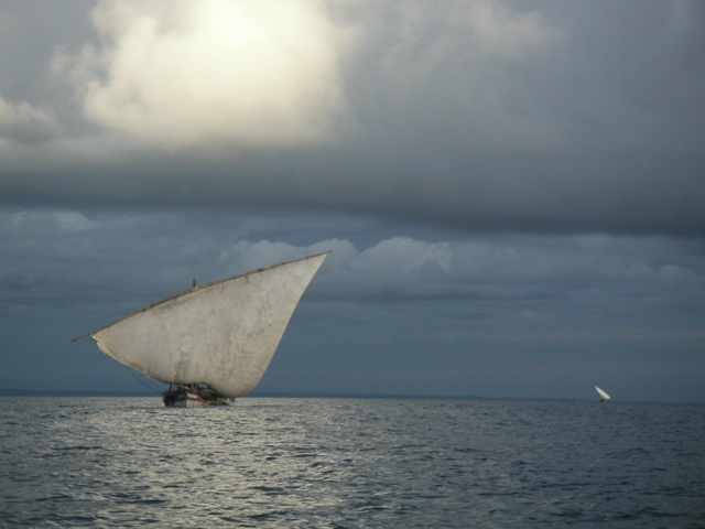 Morgens auf dem Indischen Ozean: eine große Dhau auf dem Weg nach Stone Town (km 13.450)