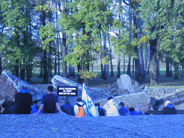 Ein Lichtblick an einem dunklen Ort: Die israelische Flagge über den Ruinen einer der früheren Gaskammern (km 875)